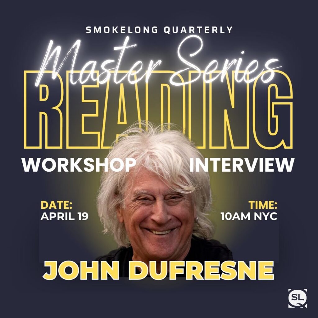 Join us for 90 minutes with multi-genre legend John Dufresne. A novelist, a short story and flash writer/editor, and an authority on the art of flash, John Dufresne has inspired us for decades. We’re thrilled to spend some time with John in our second Master Series event, a combination of interview, reading, and workshop.