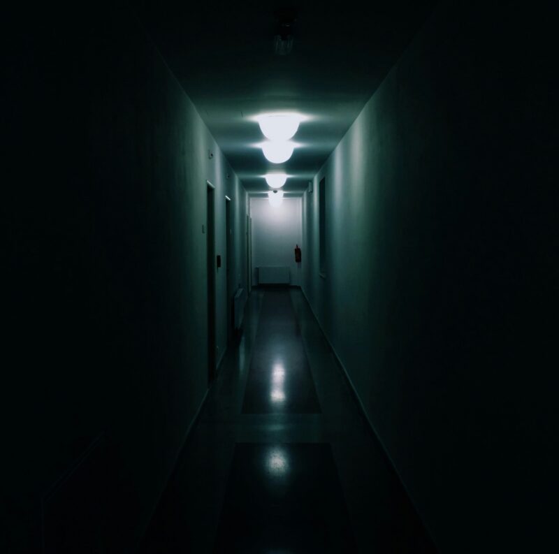 At the end of the hall, she leans into the ice machine, its blue hum shivering up her spine. The carpet smells like wet cardboard left too long in the rain. She waits—an orb weaver plucking strands.