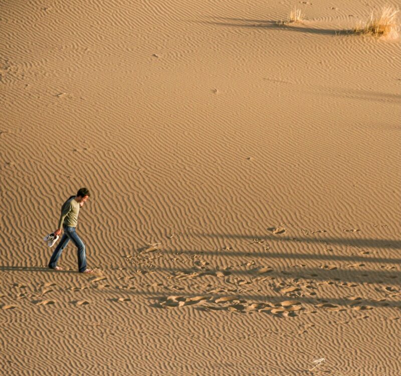I ask to join him on his reshoots before I go. We drive three hours off-road, the truck packed with water and camera gear. He parks by a cluster of mesquite and spends an hour setting up the shot, the sun hard and high. He looks through the viewfinder and asks me to grab the lens cleaner.